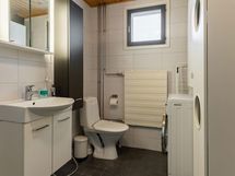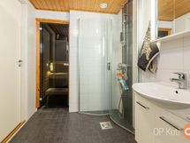 - Sauna, sähkökiuas, kylpyhuone, suihku, suihkuseinä, peilikaappi, kaapit, allaskaappi, pesukoneliitäntä, lattialämmitys, kiinteät valaisimet.
