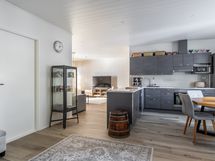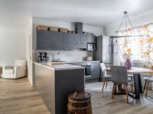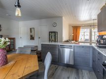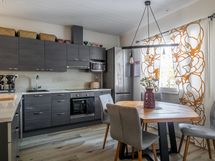 Keittiön varusteet: Jääkaappipakastin, erillisuuni, liesi, liesituuletin, mikroaaltouuni, astianpesukone ja keittiösaareke. Liesi: Induktioliesi. Työtason materiaali: Laminaatti.