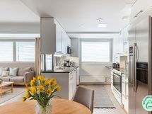 - Jääkaappi/pakastin, keraaminen liesi, liesikupu/-tuuletin, astianpesukone, kaapistot, kiinteät valaisimet