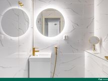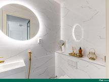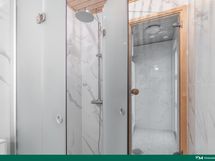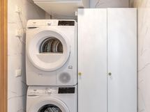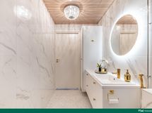 - Kylpyhuone: Suihku, taittuvat suihkuseinät, seinä-wc, valopeili, allas ja allaskaappi, kivitasot, korkea sivukaappi. Kylpyhuoneen katossa "tähtitaivas"-valot. Kodinhoitohuone: pesukoneliitäntä, tilaa pesutornille, siivouskomero. Erillinen wc: seinä-wc, allas, allaskaappi, valopeili.