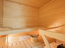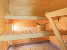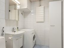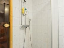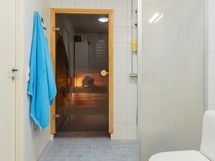 Sauna, sähkökiuas, kylpyhuone, suihku, suihkuseinä, peilikaappi, allaskaappi, pesukoneliitäntä, lattialämmitys, kiinteät valaisimet. Saunasta ja kylpyhuoneesta poistoilman säätö tapahtuu liesituulettimesta.