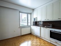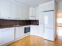 - Keittiön varusteet: Jääkaappipakastin, liesi, astianpesukone ja liesituuletin. Liesi: Sähköhella. Työtason materiaali: Laminaatti.