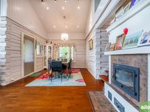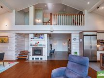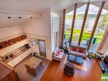 The home is equipped with underfloor heating powered by a ground source heat pump. A heat-storing fireplace and electric backup provide additional warmth during colder months, and a heat pump ensures efficient summer cooling. The layout is split-level with two bedrooms on the main floor and two upstairs.
