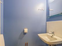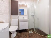Varusteet: suihkuseinä, allaskaappi, peilikaappi, pesukoneliitäntä