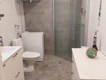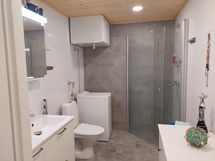 Suihku, Suihkuseinä, Pesukonevalmius, Allaskaappi, Laattalattia, Laattaseinä, Lattialämmitys, Peilikaappi