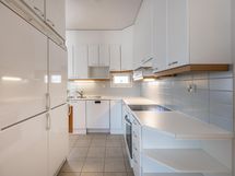- Jää/viileäkaappi, pakastekaappi, keraaminen liesi, liesikupu/-tuuletin, astianpesukone, kaapistot, kiinteät valaisimet. Työtasot laminaattia