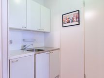 - Keittiön varusteet: Jääkaappipakastin, astianpesukone, liesi ja liesituuletin. Työtason materiaali: Laminaatti.