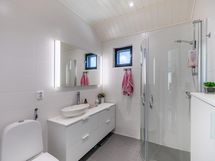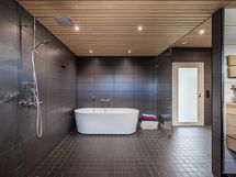 - Kylpyhuone: suihku x2, amme (ammeen takana varaus poreammeelle). Sauna: Harvian Heti valmis-kiuas (9kWh), ikkunat kahteen suuntaan. WC yläkrt: suihku, kääntyvät suihkuseinät, allaslaatikosto, allas, seinäkaappi, wc-istuin, valopeili, bidee. WC alakrt: valopeili, wc-istuin, allaslaatikosto, seinäkaapit, bidee.