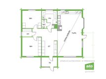 Kodin materiaalit ovat luonnonläheisiä ja kestäviä: hirsipaneeliseinät, lankkulattiat ja puunsävyiset pinnat henkii laatua ja rauhaa. Kaksi makuuhuonetta, tilava vaatehuone ja kodinhoitotila tekevät asumisesta sujuvaa.
