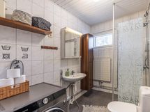 - Kylpyhuone, suihku, suihkuseinä, pesukoneliitäntä, peilikaappi. Kylpyhuone remontoitu n. 15 vuotta sitten. Saunan kiuas uusittu ja seinät maalattu v. 2022.