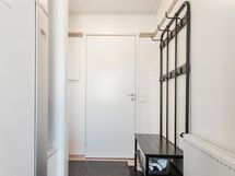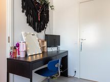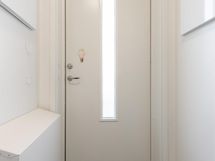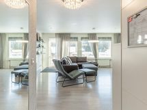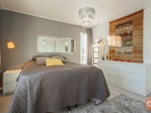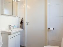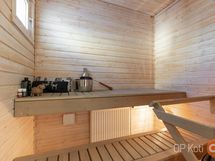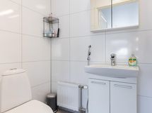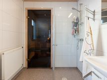 Sauna, sähkökiuas, kylpyhuone, erillinen wc, suihku, suihkuseinä, peilikaappi, allaskaappi, pesukoneliitäntä, lattialämmitys, kiinteät valaisimet.
