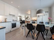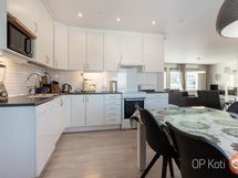 Jääkaappi, pakastekaappi, lattialiesi, liesituuletin, astianpesukone, kaapistot, kiinteät valaisimet, pöytätasojen materiaali Kovapinnoitettu laminaatti.