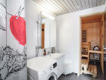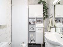 - Suihku, Pesukoneliitäntä, Mukavuuslattialämmitys, Tilaa pesukoneelle, Kaapisto, Allas, Peilikaappi