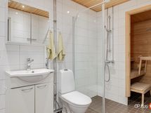 - Sauna, sähkökiuas, kylpyhuone, suihku, suihkuseinä, peilikaappi, allaskaappi, pesukoneliitäntä, lattialämmitys, kiinteät valaisimet.