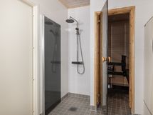 Pesutilojen kuvaus: Kylpyhuone remontoitu 2023. Varustus: suihkuseinä, pesukoneliitäntä, lattialämmitys, wc-istuin, suihku, peili, kylpyhuonekaapisto.
