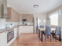Liesi: induktio. Kylmäsäilytys: jääkaappi/pakastin. Varustus: liesituuletin, astianpesukone. Keittiö remontoitu 2011-2012.