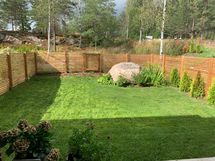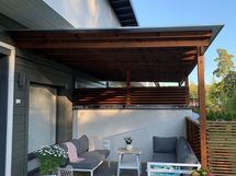 Upea iso terassi kutsuu nauttimaan ulkoilmasta – osa siitä on katettu. Aidattu piha tarjoaa turvallista tilaa lapsille tai lemmikeille.