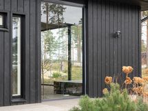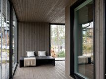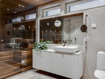 - Kuvaus: Ikkunallinen sauna on jaettu kylpyhuoneesta lasiseinällä. Puumateriaali: lämpökäsiteltyä magnoliaa. sähkökiuas