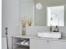 Wc-istuin, allas, allaskaappi, peili, Tapwellin hana, kvartsitaso.