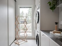 Käytännöllinen ruokakomero keittiön vieressä: pakastin, kaapistot.
