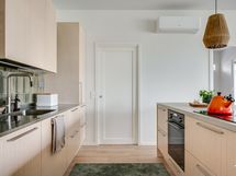 Varustelu: induktioliesi, integroitu liesituuletin, uuni, jääkaappi, kaapistot, saareke, mikroaaltouuni,, Tapwellin hana.