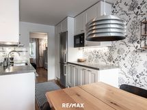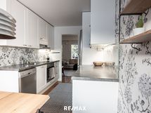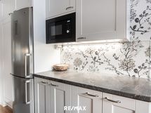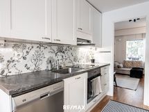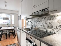 - Keittiön varusteet: Jääkaappipakastin, uuni, liesi, liesituuletin, mikroaaltouuni ja astianpesukone. Liesi: Induktioliesi. Työtason materiaali: Laminaatti.