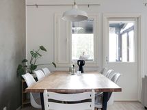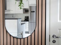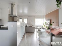 Ruokailutilan paikan voi valita vaikka keittiön molemmilta puolilta. Keittiön kaappien välitila on lasia, jonka takana on tapettia. Pistorasioita on upotettu tasoon.
