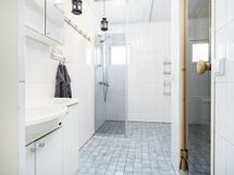 - Pesutilojen varusteet: WC-istuin, lattialämmitys, allaskaappi, peilikaappi, suihkuseinä, pesukoneliitäntä, suihku ja kiinteät valaisimet. Pesutilojen kuvaus: Alakerran pesutiloissa kivirakenteiset seinät.