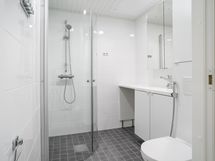 Suihku, Suihkuseinä, Pesukonevalmius, Laattalattia, Laattaseinä, Peilikaappi, Allaskaappi, Lattialämmitys
