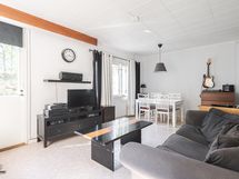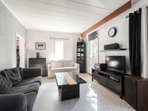 Tilava ja valoisa olohuone. Käynti terassille.