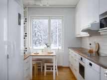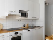- Liesi: induktio, erillisuuni. Työtasot: laminaatti. Kylmäsäilytys: jääkaappi, pakastin. Varustus: astianpesukone, kiinteät valaisimet, liesituuletin / suodatin. mikrolle paikka kalusteessa