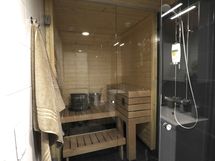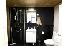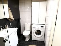 - Suihku, Suihkuseinä, Pesukonevalmius, Peilikaappi, Allaskaappi, Laattalattia, Laattaseinä, Lattialämmitys, WC, kaappi pesukoneen ympärillä