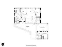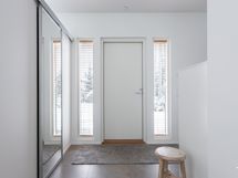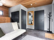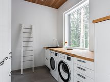 Olohuoneesta on käynti kauniiden pariovien talon kolmanteen makuuhuoneeseen, josta löytyy myös kaapistot. Tilavan kodinhoitohuoneen kautta on kulku lasitetulle terassille, joka yhdistää päärakennuksen kätevästi saunarakennukseen. Matka omalle ”mökille” taittuu näin kuivin jaloin ympäri vuoden.