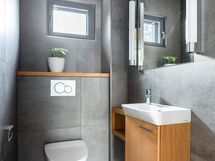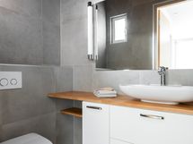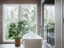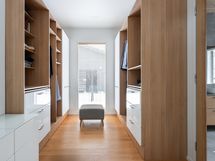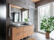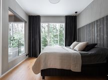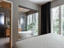 Sisäänkäynnin yhteydessä on vaatesäilytystilaa sekä erillinen wc. Seuraavaksi vastaan tulee päämakuuhuone, josta on kulku ylelliseen kylpyhuoneeseen. Kylpyhuoneen ja päämakuuhuoneen välissä on suuri ikkuna, joka tekee tilasta erityisen valoisan ja uniikin. Amme on arvoisellaan paikalla kahden suuren ikkunan edessä, joista avautuu rauhallinen näkymä metsään. Kylpyhuoneessa on lisäksi kahdella malja-altaalla varustettu allaskaluste sekä lasiovien takana erillinen wc ja suihku. Toinen makuuhuone toimii tällä hetkellä pukeutumishuoneena, ja se on tarvittaessa helposti muokattavissa makuuhuonekäyttöön. Talossa on kauniit tammiviilupintaiset väliovet, jotka tuovat lämpöä ja kontrastia vaaleille pinnoille.