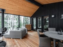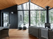 Suuri lasitettu terassi on korkeaa tilaa ja sieltä avautuvat rauhoittavat näkymät takapihan metsään. Kulmauksessa tunnelmaa luo Jotulin valurautakamiina. Tilassa on lisäksi kaukosäätimellä toimiva infrapunalämmitin. Saunarakennuksesta löytyy sauna, suihkuhuone kahdella sadesuihkulla, erillinen wc sekä huone, joka taipuu kätevästi työhuoneeksi, harrastetilaksi, vierashuoneeksi tai vaikka makuuhuoneeksi omaa rauhaa kaipaavalle. Saunassa on puukiuas mutta myös varaus sähkökiukaalle.