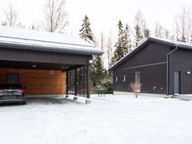 Etupihalla on suuri terassialue. Terassit ovat Siperian lehtikuusta, joka onkin jo harmaantunut kauniisti. Terassilla on kaukosäätimellä toimiva markiisi sekä sähkövaraus porealtaalle. Lisäksi löytyy katos kahdelle autolle. Autokatoksen yhteydessä on kaksi erillistä lämmintä varastoa. Talo ja saunarakennus lämpiävät edullisesti ja ekologisesti maalämmöllä. Talo viilenee kesäisin maaviileällä kattokonvektorin kautta. Sähkönkulutus on ollut nykyisillä asukkailla vain 11 700 kwh (vuosi 2025). Rakennusoikeuttakin on jäljellä 94m².