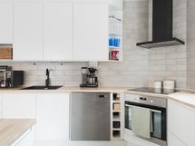 Valkoiset tasapintaiset kaapistot, ovet ja tasot uusittu 2021.