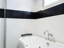 Ikkunallinen kylpyhuone, jossa on suihku, suihkuseinä ja poreamme.