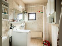 Kylpyhuone, suihku, peilit, pesukoneliitäntä.