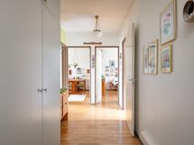 Keittiö: Parketti ja seinät maalattu. Olohuone: Parketti ja seinät tapettia. Makuuhuone 1: Parketti ja seinät tapettia. Makuuhuone 2: Parketti ja seinät tapettia. Kylpyhuone: Laattalattia ja seinälaatta. Eteinen: Parketti.