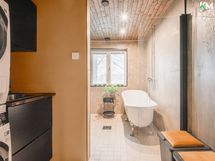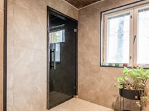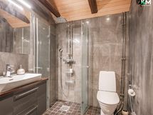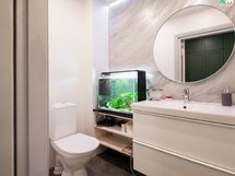 - Kph/khh: pyykinpesukoneliitäntä, allas, hana, kaapisto, varaus kuivausrummulle, suihku, kylpyamme lattia: laatta, seinä: laatta/ mikrosementtiä/maali, sähköinen lattialämmitys. Sauna: puukiuas, lauteet, paneloidut seinät, lattia: laatta. Erillinen wc: wc-istuin, bidee-suihku, allas, hana, allaskaappi, peili, lattia: mikrosementti, seinät: maalattu. Yläkerran kph/wc: suihku, taitettavat suihkuseinät, wc-istuin, bidee-suihku, allas, hana, peilikaappi, allaskaappi, sähköinen lattialämmitys.