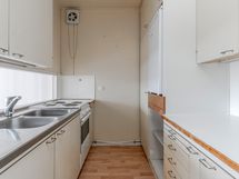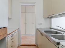 - Alkuperäinen keittokomero, jossa tasot ja kaapistot sekä sähköliesi ja jääkaappi.
