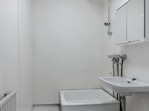 - Kylpyhuoneeseen mahtuu suihkun, wc-istuimen ja käsienpesualtaan lisäksi oma pesukone. Varustukseen kuuluu myös peilikaappi. Lattialla on muovimatto ja seinät levyseiniä.