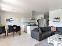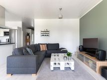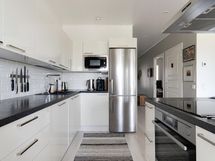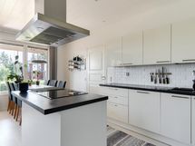 - L-muotoinen Puustellin laadukas avokeittiö, jossa kalusteisiin integroidut AEG:n kodinkoneet (pl. jääkaappi/pakastin): Jääkaappi/pakastin, kalusteuuni höyry- ja pyrolyysitoiminnolla sekä paistomittarilla, induktiotaso silta-toiminnolla, liesituuletin hormiin, astianpesukone ylös nousevalla alakorilla, integroitu mikro. Kiinteä led-valaistus katossa ja välitilassa led-nauha. Laminaattitasot ja välitila laatta.