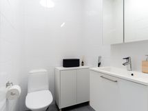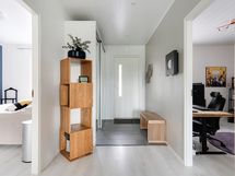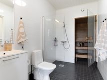 - Yhdistetyssä kylpy-/kodinhoitohuoneessa on suihku, WC, pesuallas, peili, allaskaappi, tilaa pesutornille ja kaappitilaa. Tilasta on oma kulku terassille ja käyttöullakolle alaslaskettavien portaiden kautta.