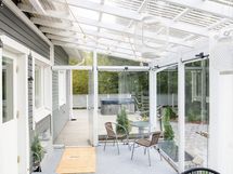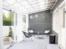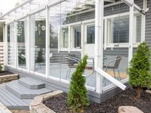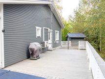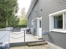 - Lasitettu terassi ( Lumon) + v. 2022 laajennettu terassi, jossa kaiteet metsän puolella ja köysikaiteet takapihan suuntaan.