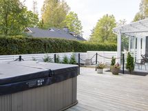Terassilla sähkötoiminen poreallas, jonka lattiakorkeutta mahdollisuus säätää.