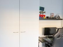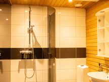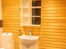 - Pesutilojen varusteet: WC-istuin, suihku, suihkuseinä, peilikaappi, allaskaappi, bidee-suihku ja pesukoneliitäntä. Pesutilojen kuvaus: Lattiassa tumman harmaat laatat, seinissä valkoiset laatat. Seinissä osittain puupanelointi.