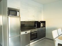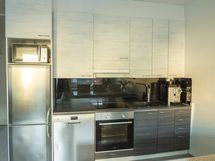- Keittiön varusteet: Jääkaappipakastin, erillisuuni, liesi, liesituuletin ja astianpesukone. Liesi: Keraaminen liesi. Työtason materiaali: Laminaatti. Vaaleat yläkaapit, tummemman harmaat alakaapit.