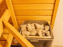 - Kiuas: Sähkökiuas. Paneloitu sauna jossa sähkötoiminen kiuas.
